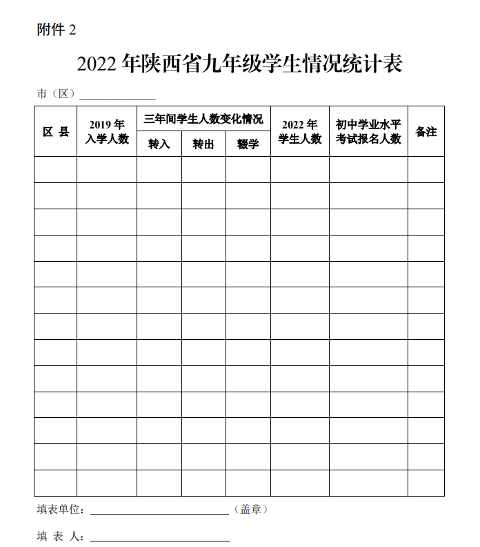 各设区市教育考试中心(招办)在考生报名结束后,负责填写《2022年陕西省八年级学生情况统计表》(见附件1)和《2022年陕西省九年级学生情况统计表》(见附件2),于2022年4月6日前以文本(加盖公章)和电子版的形式报送省教科院评价研究中心(联系人:刘诚;电话:029-85370511;邮箱:pjkszx@126.com)。