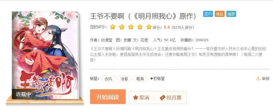 作为互联网时代圈层消费的产物,动漫是城市亚文化的重要载体,拥有大量用户的漫画在真人改编时本就自带流量。和《银魂》、《复仇者联盟》这些享誉全球的作品相同,《明月照我心》亦是自带流量光环,在电视剧开播之前,其原著漫画《王爷不要啊》就已经在腾讯动漫获得了高达9.4分的高分,以及高达50亿的超高人气。